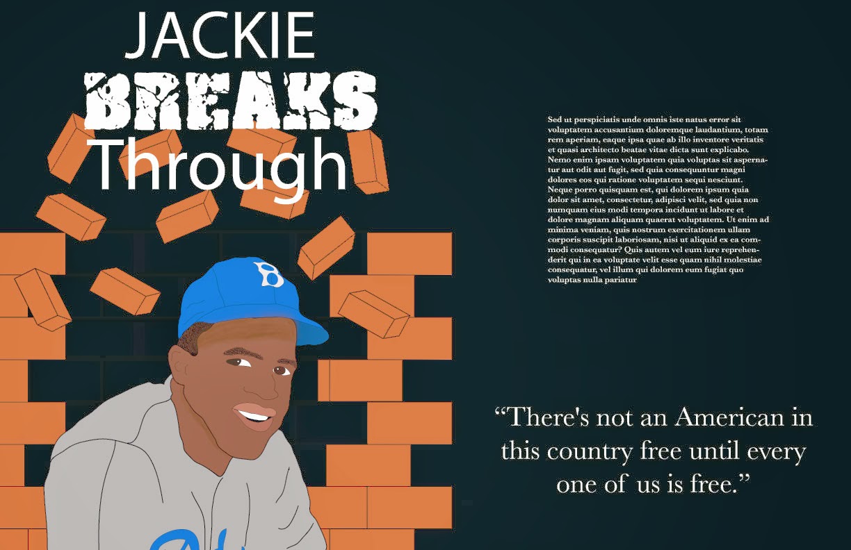 Here is the most I've gotten out of my layout. Since I couldn't figure out the stroke/negative space issue, I did it in block text. I also couldn't figure out how to fade off the bricks instead of them just stopping. I added the quote by Jackie Robinson because it relates to the freedom he achieved during his time as a professional baseball player. My typographical choices were pretty simple. I wanted a simple, classy text to surround the "broken" text to make it stand out. The simple text is in Baskerville and the word "BREAKS" is a font that I downloaded from fontspace.com called cracked and bold. Overall, I think it's pretty cool! This was a fun assignment.